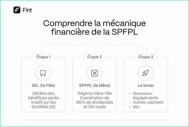 L'un des atouts majeurs de la SPFPL réside dans l'application du régime mère-fille. Lorsque votre société d'exercice (la SEL) distribue des dividendes à votre SPFPL (la société mère), ces dividendes bénéficient d'une exonération fiscale quasi-totale. Concrètement, 95% des dividendes remontant à la SPFPL sont exonérés d'impôt. Cela signifie que les bénéfices générés par votre activité dentaire peuvent être réutilisés ou réinvestis avec une charge fiscale considérablement réduite. Cette structure évite ainsi une double imposition qui serait autrement appliquée si les dividendes étaient versés directement à des associés personnes physiques.
